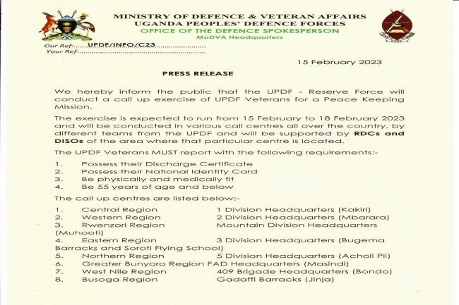 We hereby inform the public that the UPDF – Reserve Force will conduct a call-up exercise of UPDF Veterans for a Peace Keeping Mission. The exercise is expected to run from 15 February to 18 February 2023 and will be conducted in various call centres all over the country, by different teams from the UPDF…