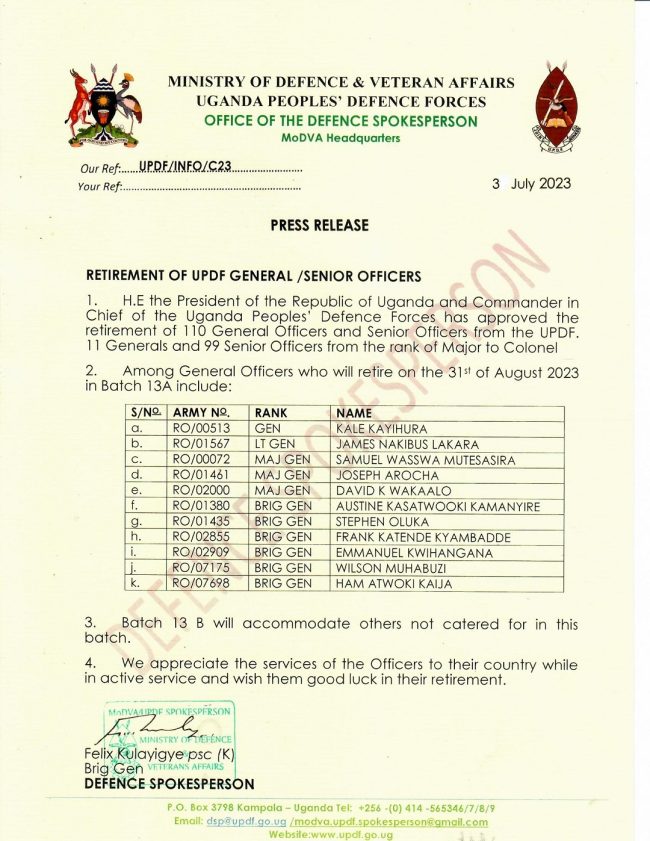 H.E. the President of the Republic of Uganda and Commander in Chief of the Uganda Peoples’ Defence Forces has approved the retirement of 110 General Officers and Senior Officers from the UPDF. 11 Generals and 99 Senior Officers from the rank of Major to Colonel. Among General Officers who will retire on the 31st of…