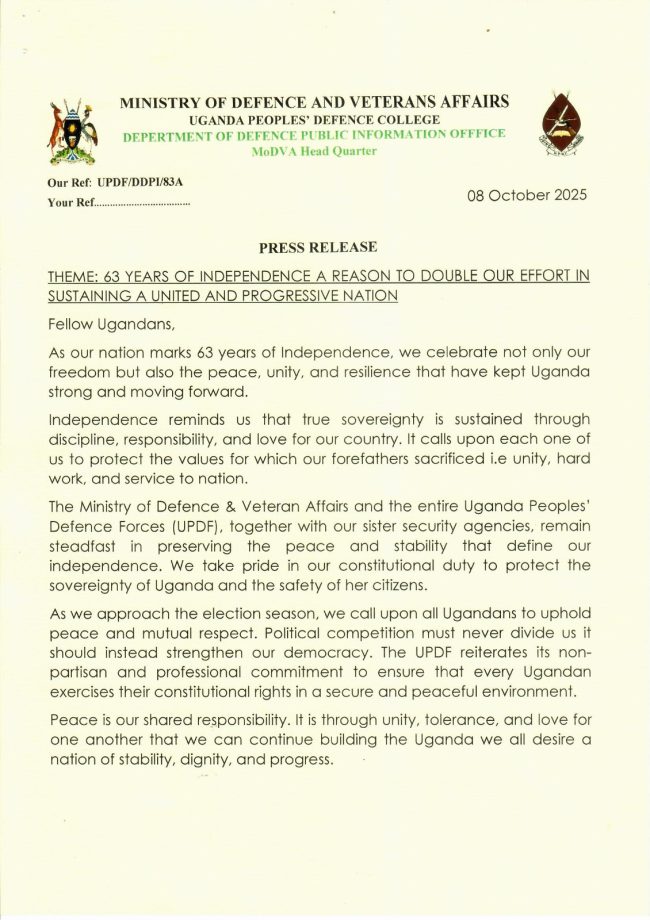 Fellow Ugandans, As our nation marks 63 years of Independence, we celebrate not only our freedom but also the peace, unity, and resilience that have kept Uganda strong and moving forward. Independence reminds us that true sovereignty is sustained through discipline, responsibility, and love for our country. It calls upon each one of us to…