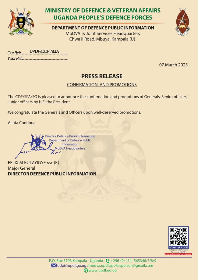 The Uganda Peoples’ Defence Forces Air Force (UPDF-AF) decorated 71 senior and junior officers at a ceremony held at its Entebbe headquarters, following their promotion by President Yoweri Kaguta Museveni. Lieutenant General Charles Okidi, the Commander Air Force presided over the event, where the highest-ranking officer was elevated to Brigadier General and junior officers to…