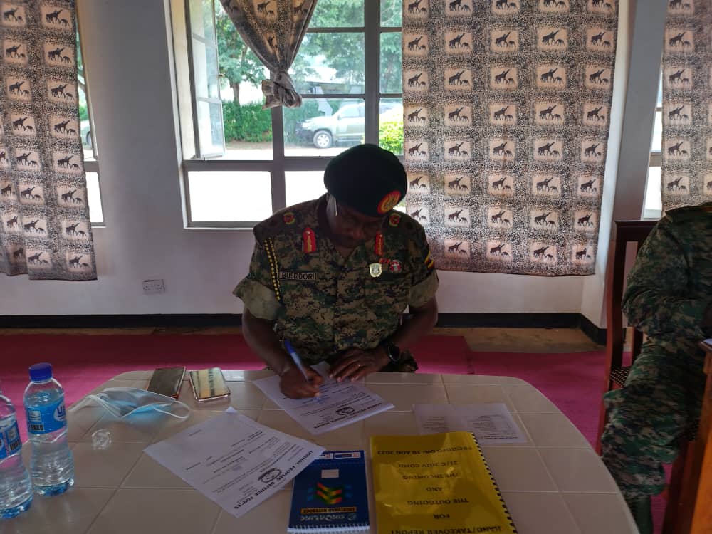 Brig Gen Felix Busizoori signs a report during the handover.