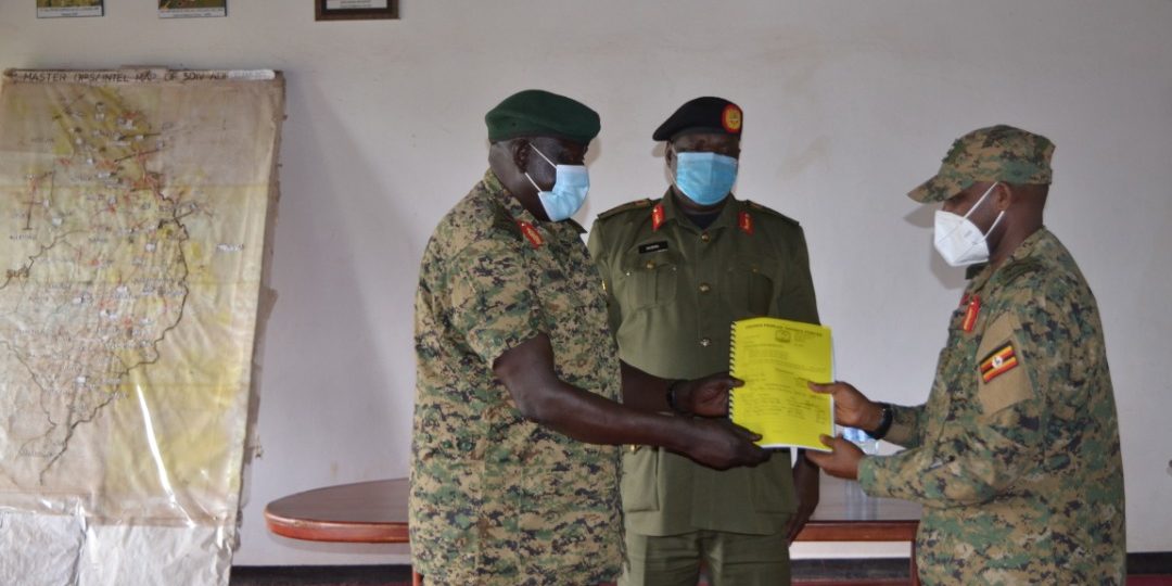 The Deputy Commander Land Forces of UPDF, Maj Gen Sam Okiding today presided over the ceremony in which Brig Gen Eriazake Okolong handed over office to Brig Gen David Mugisha as second in Command of the 3 Infantry Division based in army barracks, Moroto District.