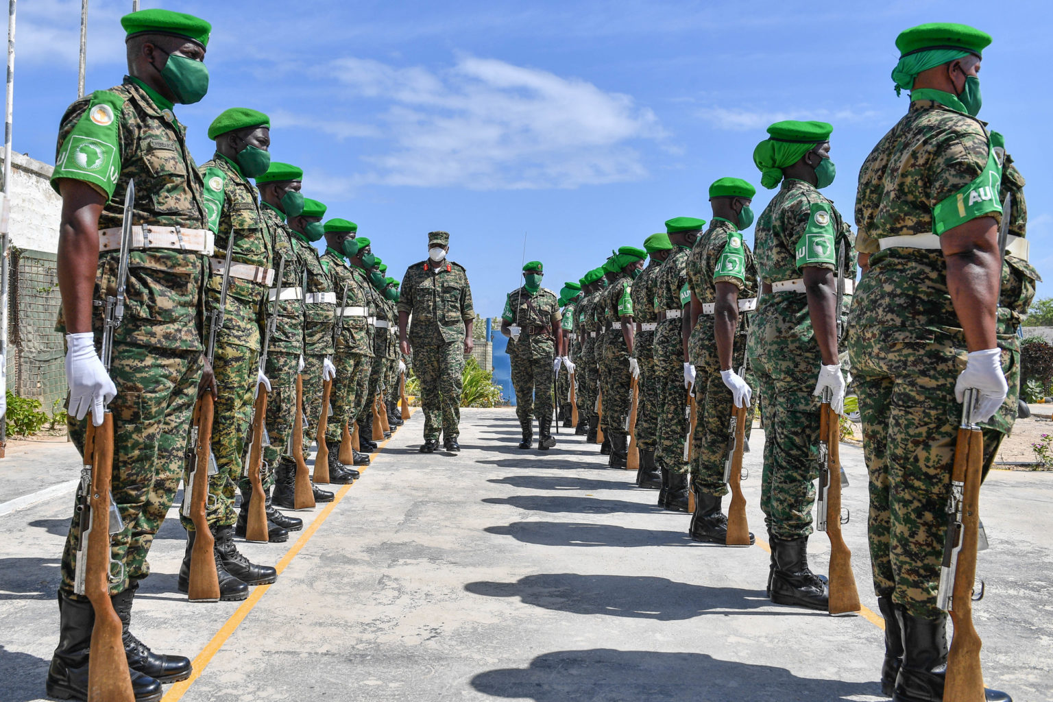 Ugandan troops serving under the African Union Mission in Somalia (AMISOM) mount a guard of honour during a visit by Uganda’s Commander of Land Force, Lt Gen Muhoozi Kainerugaba, to Somalia on 23 September 2021.