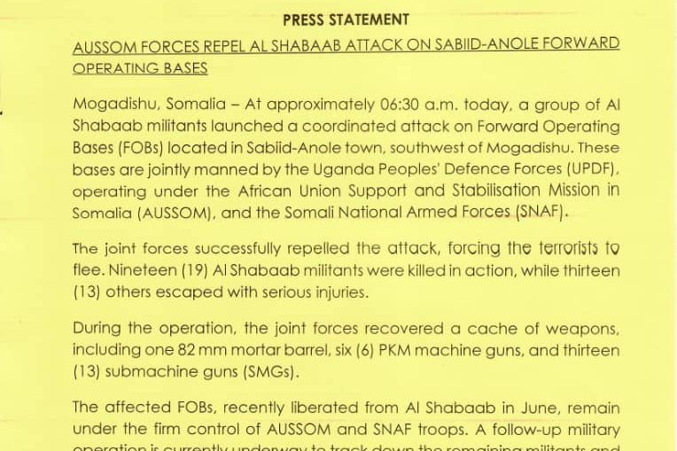Jul252025 Press Statements AUSSOM Forces Repel Al Shabaab Attack On Sabiid-Anole Forward Operating Bases Read more