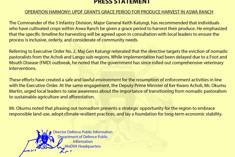 Aug12025 Press Statements OPERATION HARMONY: UPDF Grants Grace Period for Produce Harvest in Aswa Ranch Read more