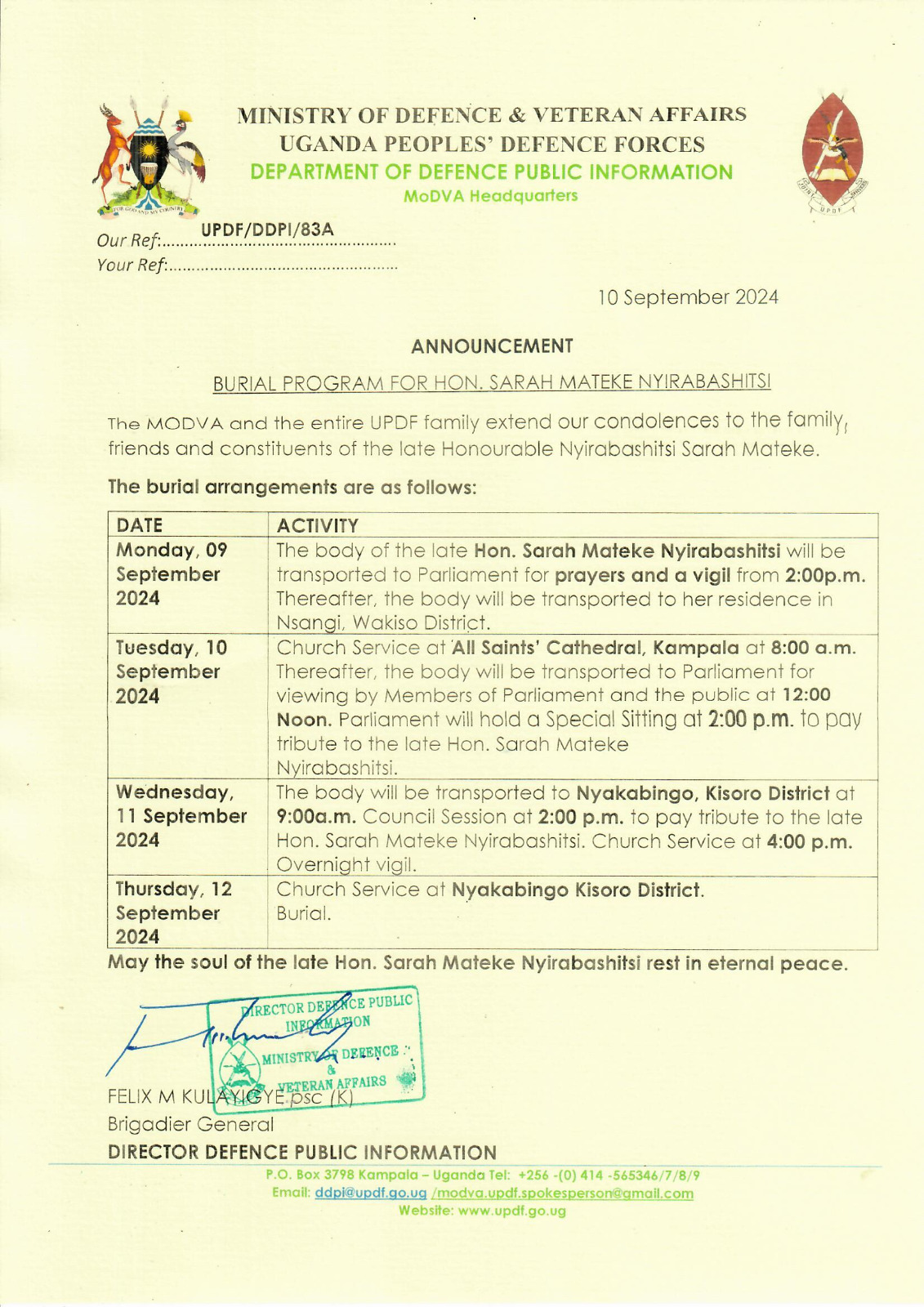 The MODVA and the entire UPDF family extend our condolences to the family, friends and constituents of the late Honourable Nyirabashitsi Sarah Mateke.