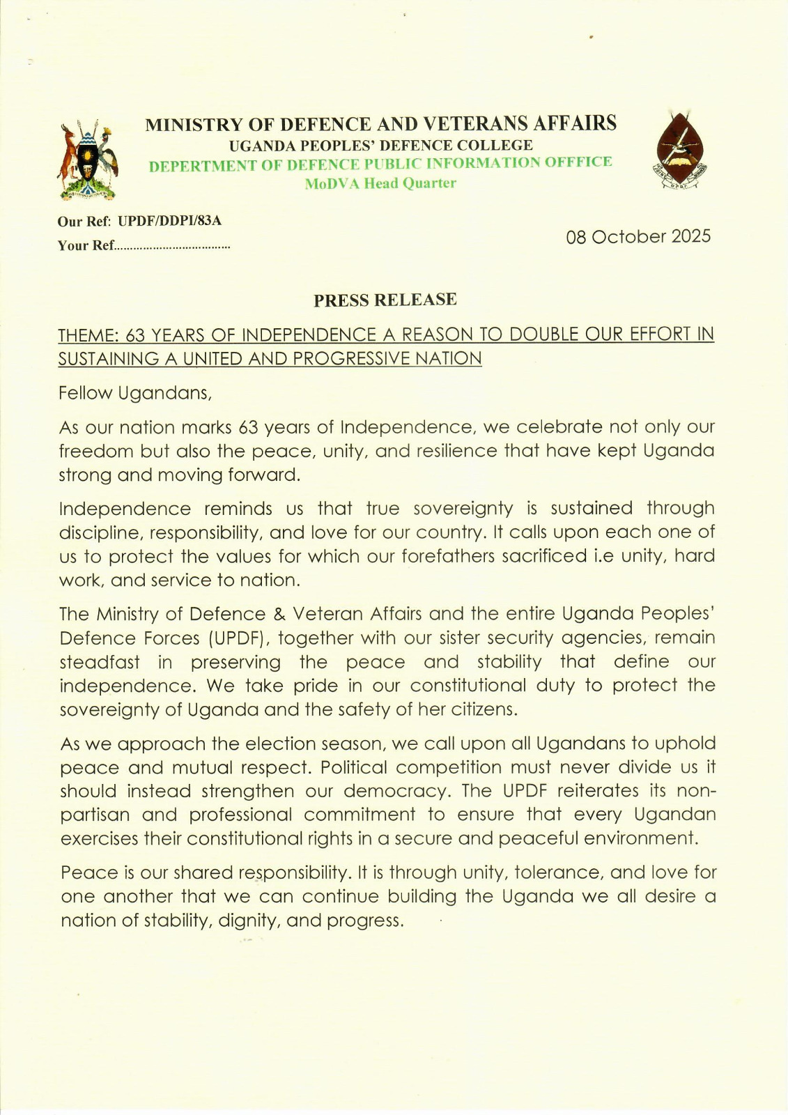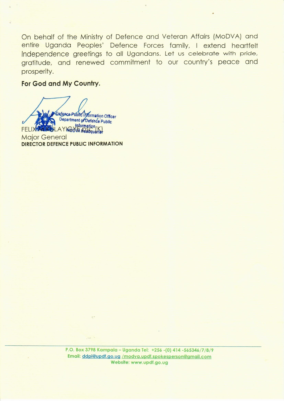 On behalf of the Ministry of Defence and Veteran Affairs (MoDVA) and entire Uganda Peoples’ Defence Forces family, I extend heartfelt Independence greetings to all Ugandans. Let us celebrate with pride, gratitude, and renewed commitment to our country’s peace and prosperity.