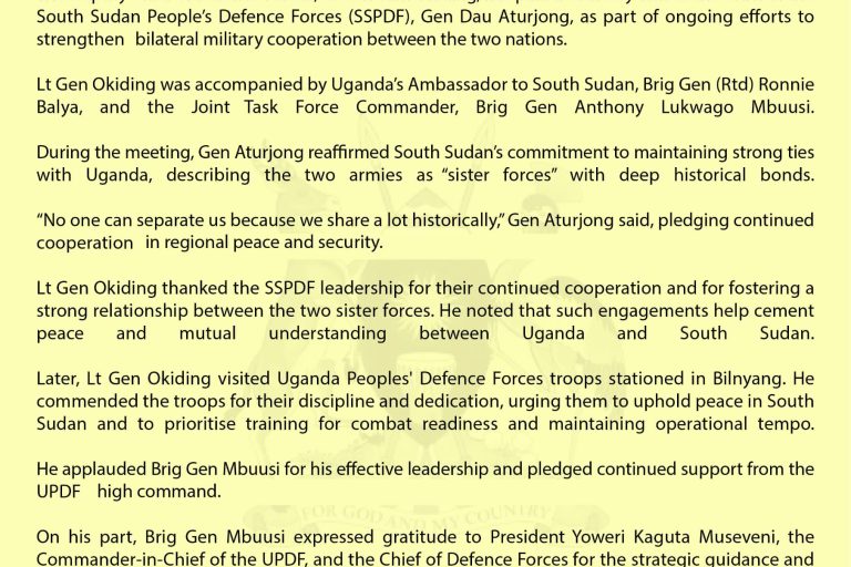 Aug22025 Press Release Lt Gen Okiding Meets South Sudan’s Defence Chief To Strengthen Military Ties Read more