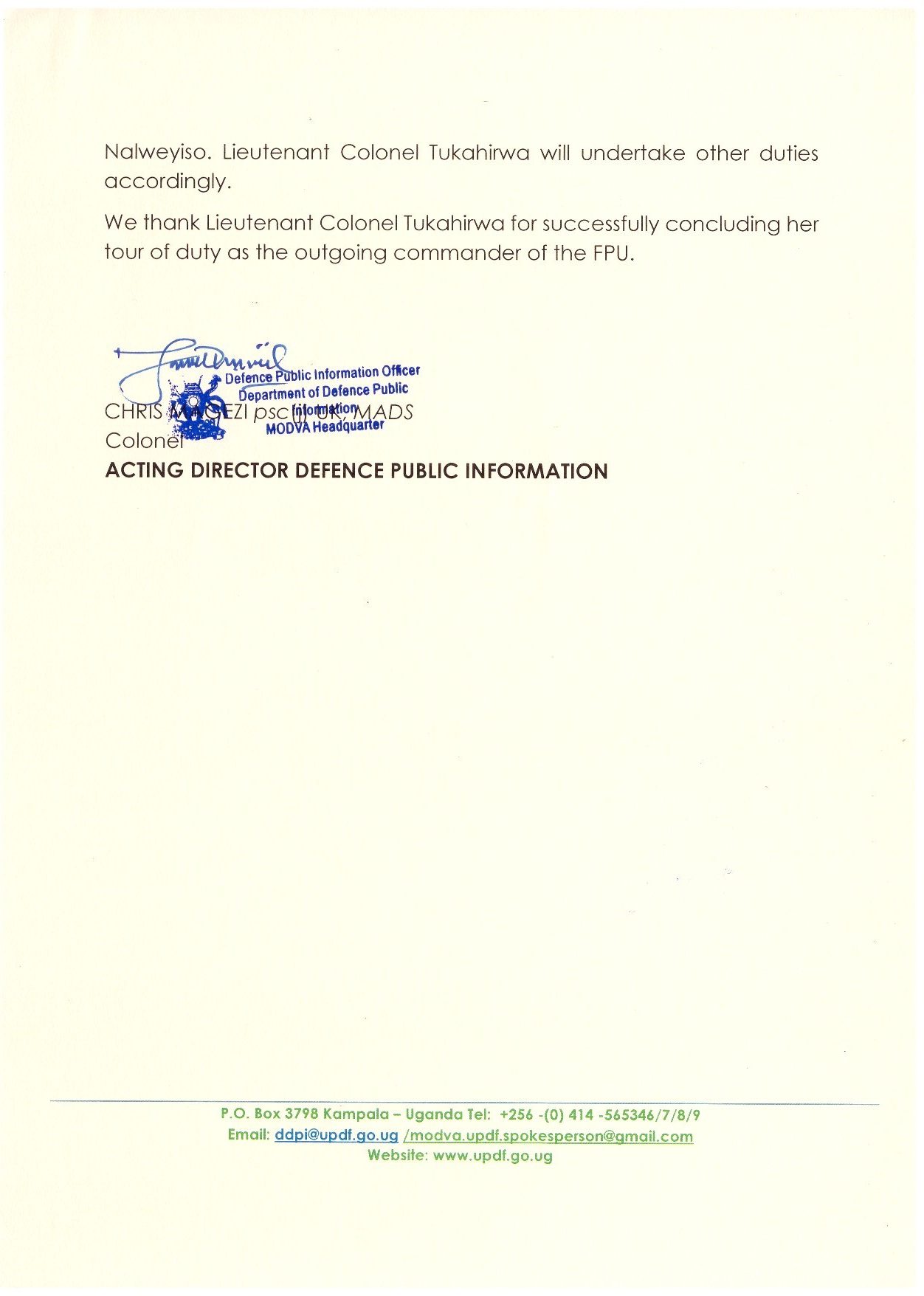 Lieutenant Colonel Mercy Tukahirwa formally of the FPU has been reassigned to the office of the Senior Presidential Advisor on Defence and Security (SPADS), Lieutenant General (Retired) Proscovia Nalweyiso. Lieutenant Colonel Tukahirwa will undertake other duties accordingly.