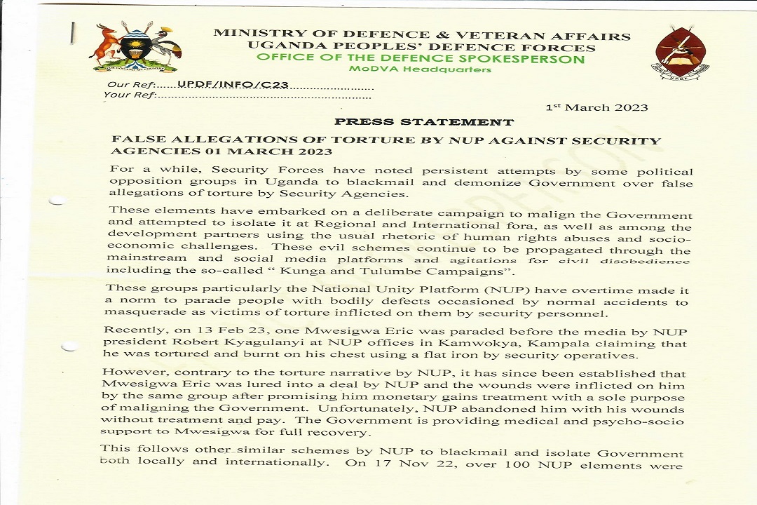 Recently, on 13 Feb 23, one Mwesigwa Eric was paraded before the media by NUP president Robert Kyagulanyi at NUP offices in Kamwokya, Kampala claiming that he was tortured and burnt on his chest using a flat iron by security operatives.