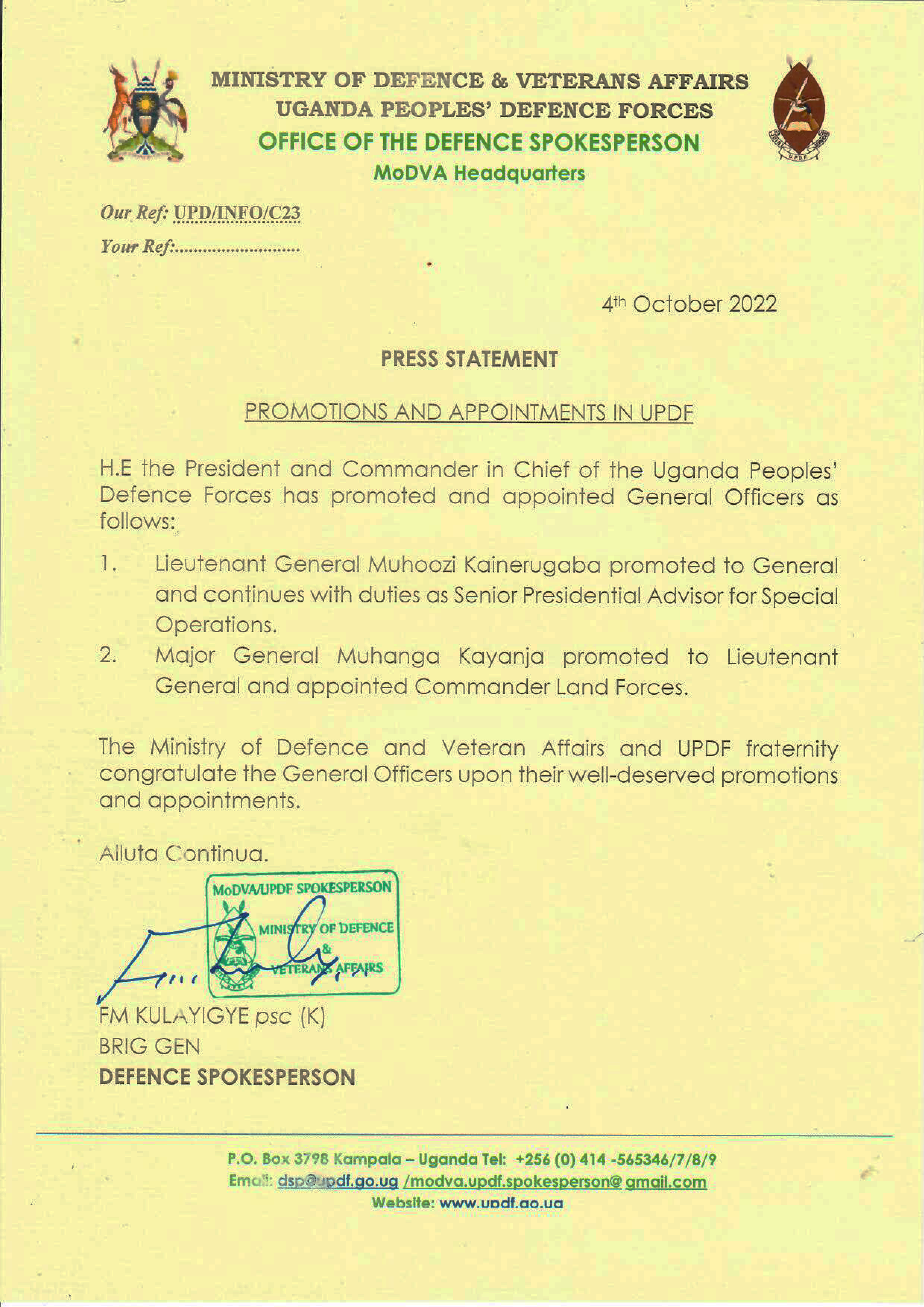 - Lieutenant General Muhoozi Kainerugaba promoted to General and continues with duties as Senior Presidential Advisor for Special Operations.