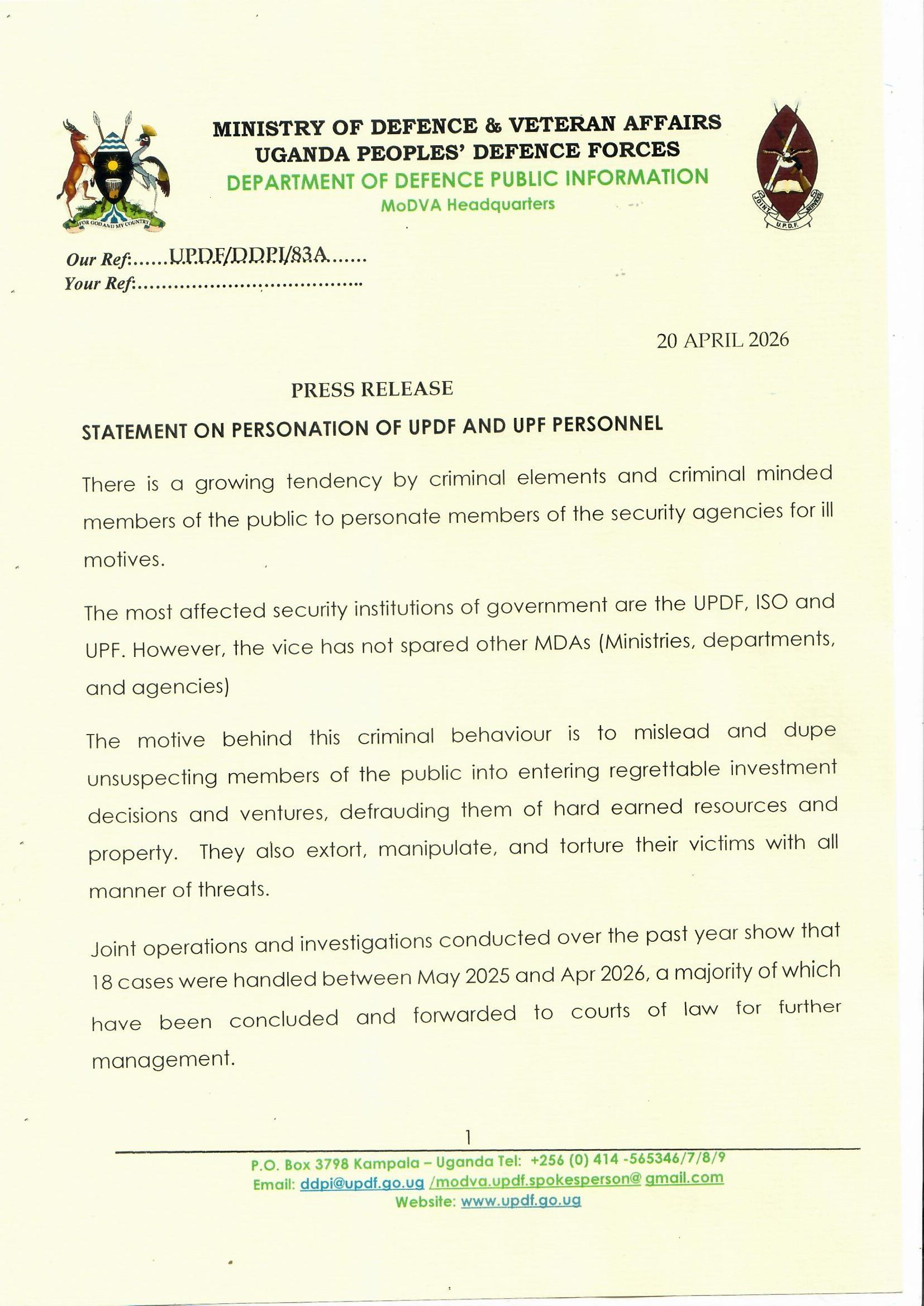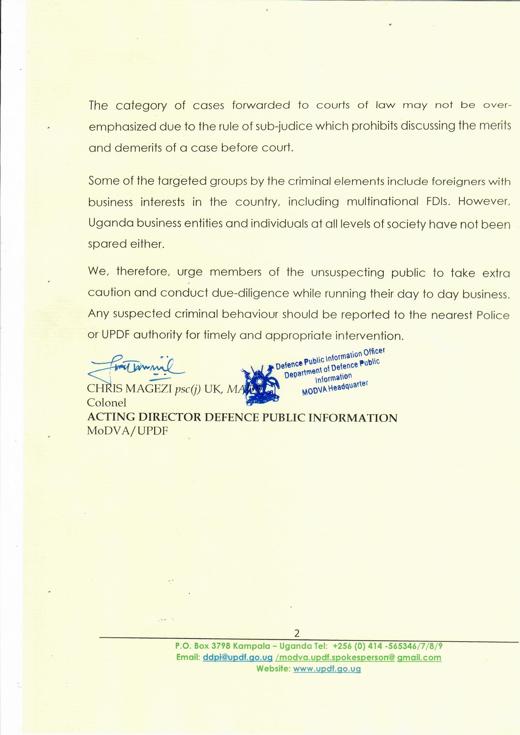 We, therefore, urge members of the unsuspecting public to take extra caution and conduct due-diligence while running their day to day business. Any suspected criminal behaviour should be reported to the nearest Police or UPDF authority for timely and appropriate intervention.