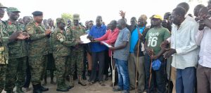 Hon. Akorokin Francis, District Chairperson, said, “The community and customary land owners, represented by Mzee Oumo Joseph and Moka George William, hand over 204 acres to UPDF for a military brigade headquarters to protect and provide security to the people of Teso, Karamoja, and Uganda.”